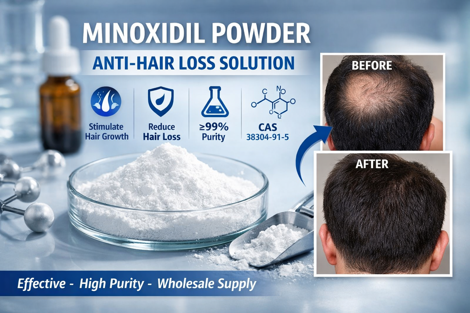 Our wholesale minoxidil powder is a premium hair loss treatment ingredient with a purity level of ≥99%, strictly adhering to USP, EP, and CP quality standards. As a white crystalline powder (CAS: 38304-91-5), it boasts exceptional potency and stability, with a shelf life of up to 3 years when stored in cool and dry conditions. Manufactured in a GMP and ISO 22000 certified factory, each batch undergoes rigorous HPLC testing, ensuring heavy metals (≤20ppm) and microbiological indicators fully comply with international pharmaceutical and cosmetic requirements.